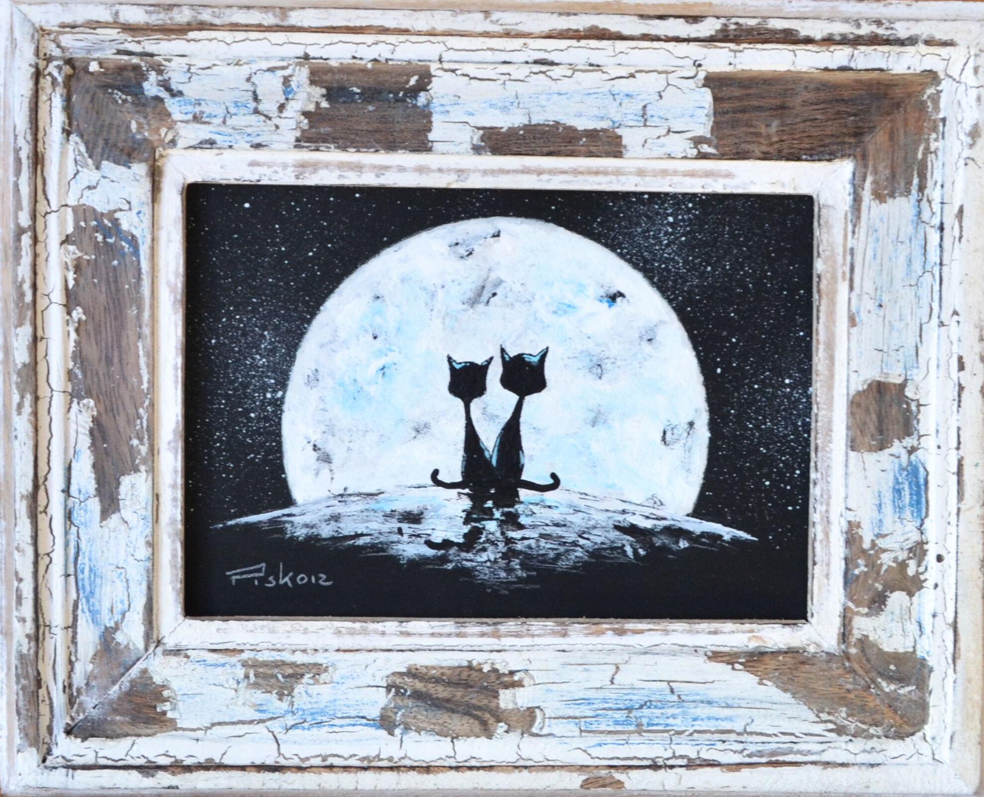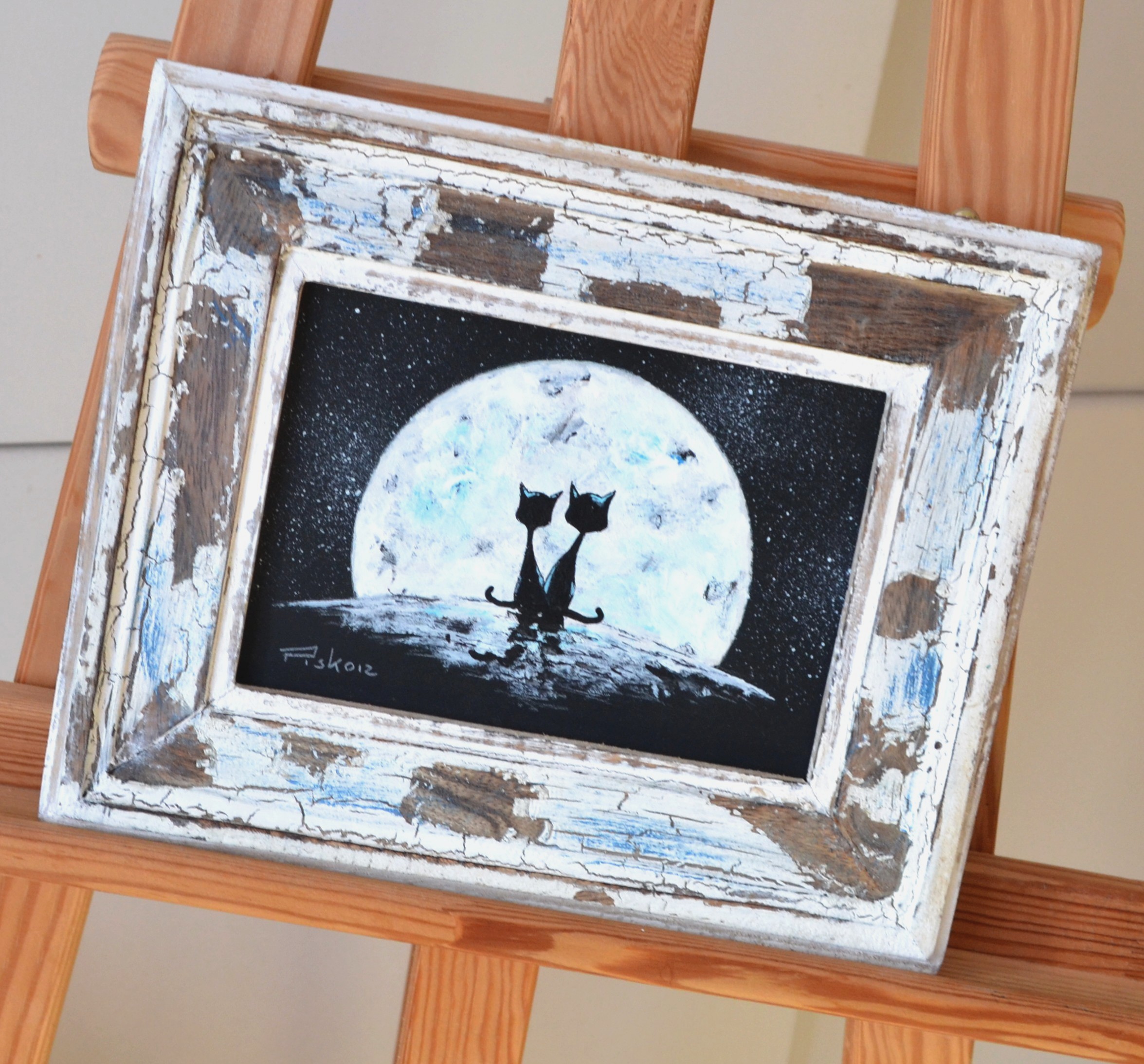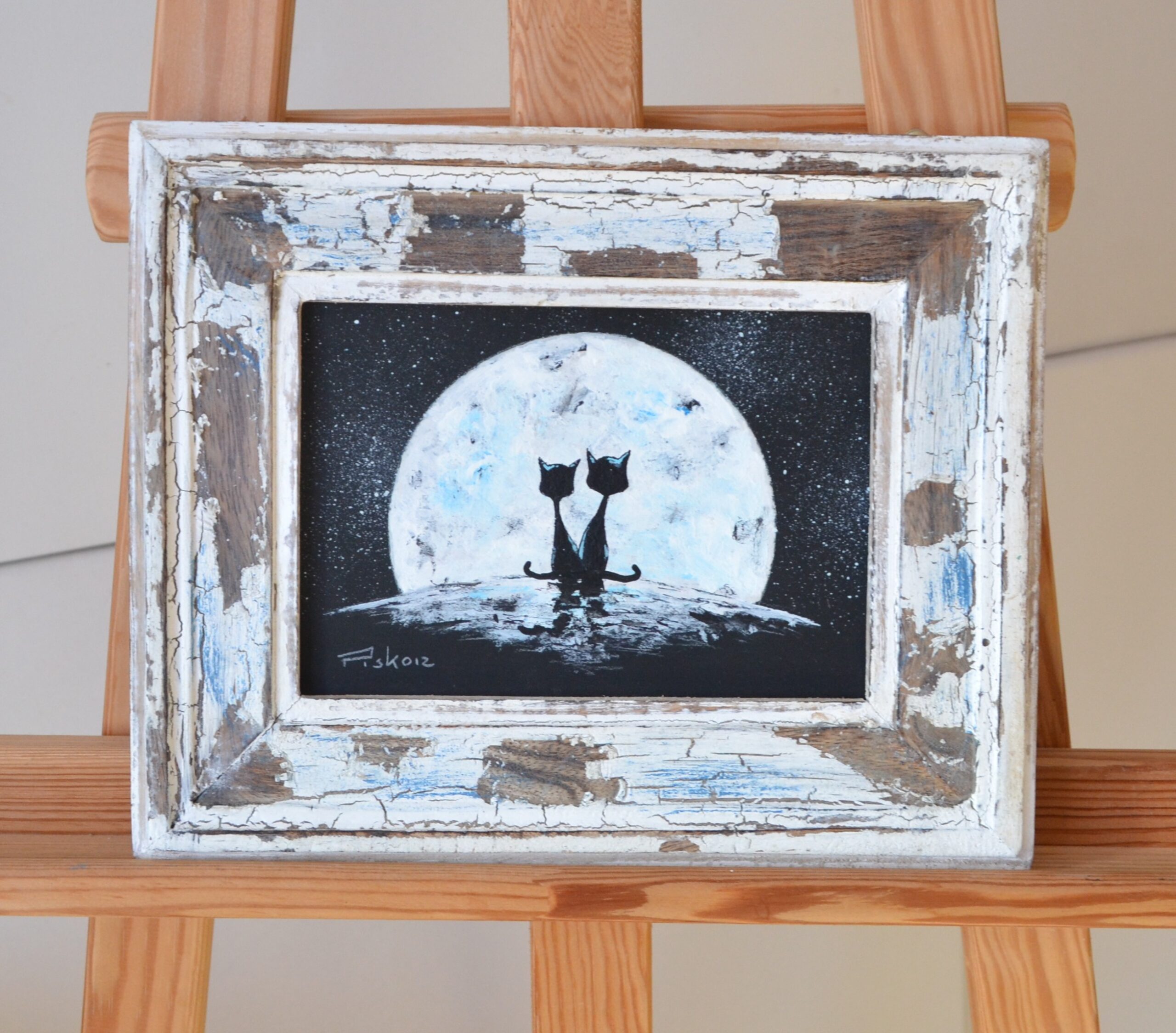Small beautiful painting by well known artist. Framed in a unique handmade frame.Acrylic on board.22cm x 26cm