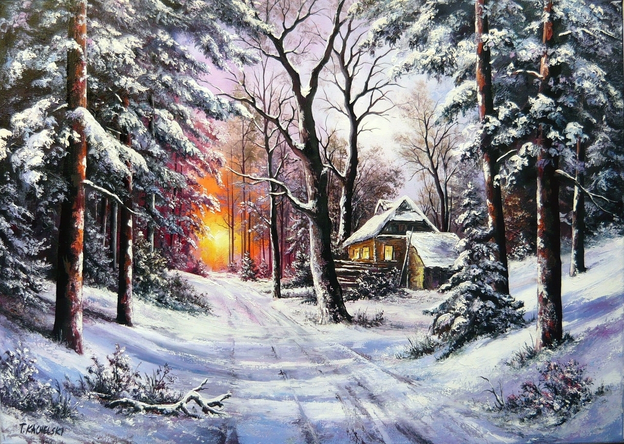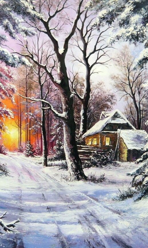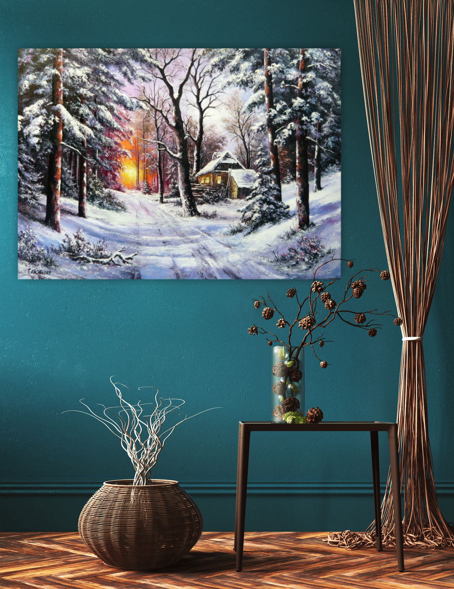 An oil painting by a well known Polish artist who specifies in painting landscapes, a painting stretched on a wooden stretcher covered with damar varnish, nothing you do classically in main interiors.
